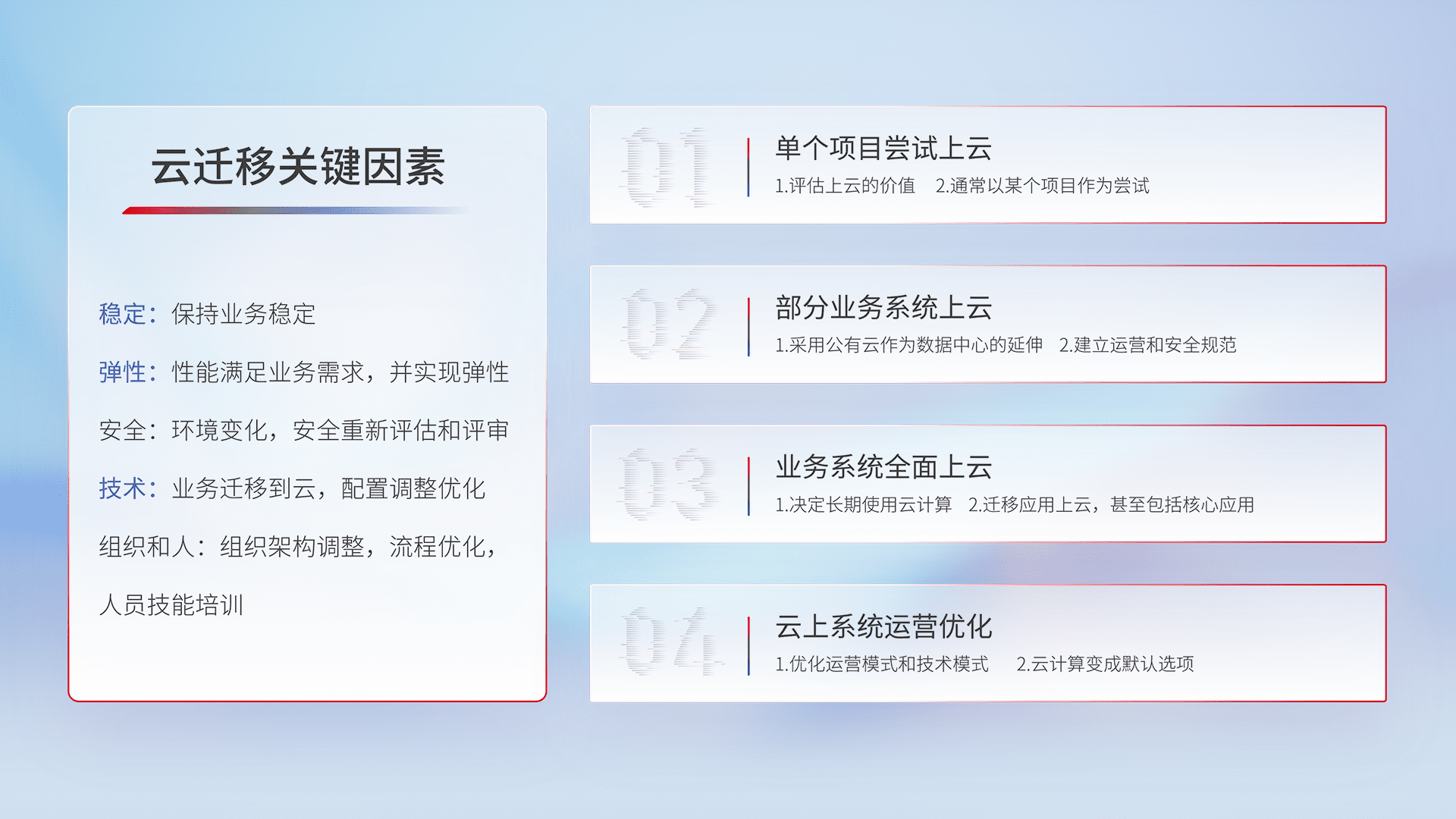 结合实际业务,,,从规划设计、、、云平台选型、、云原生改造、、、、数据迁移、、、、集成交付,,迁移全过程为客户识别最佳上云路径,,,做好风险识别管理,,,设计网络架构、、、、身份权限、、、安全审计合规、、操作审计、、、日志审计、、、监控告警策略、、多站点容灾设计等,,,对云上基础设施进行整体规划,,提升IT治理水平,,,以满足弹性、、、、高可用、、、、高性能的需求。。。