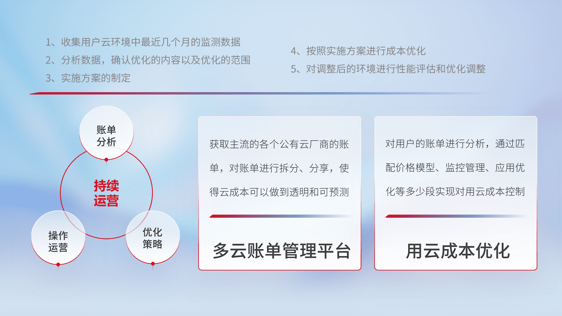 通过多云纳管,,,,以统一的资源数据模型把客户的云资源进行抽象和封装,,,进而实现对多云资源的统一操作,,,,保障云资源管理的可靠性、、、稳定性与可用性。。量身定制化运维内容,,,,配置、、开发运维、、补丁管理、、、备份、、、监控、、、、认证和访问管理、、审计和日常巡检等,,,保障在用云过程中的可靠度,,,稳定度以及高可用率。。。。